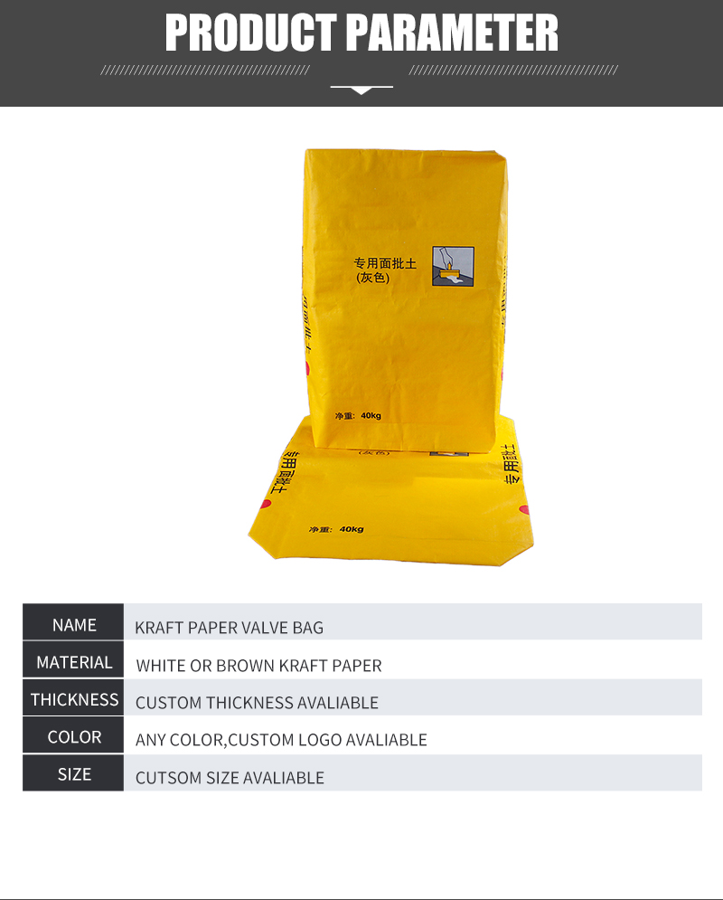 1. The kraft paper valve bag is made of 3 layers kraft paper or 2 layers kraft paper + 1 layer pe film, featured with highly durability, can hold 5kg, 10kg, 20kg, 25kg, even 50kg capacity depending on the bag size, so the valve bag