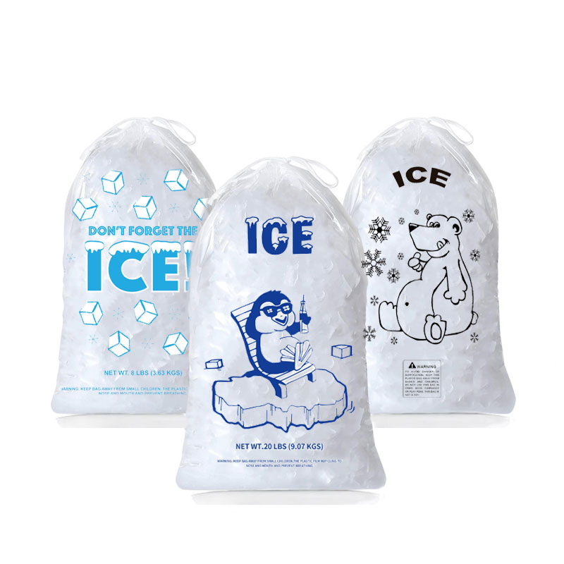 High-quality ice bags are typically made from 38 to 48 micron low-density polyethylene (LDPE). This thickness provides the puncture resistance needed to hold sharp ice cubes. There are three common styles on the market: flat bags, drawstring bags, and star-sealed bags. Among these, the drawstring style is the most widely used. The drawstring handle helps distribute the weight evenly, which effectively prevents the bag from breaking suddenly when it is full and being carried. For restaurants,
