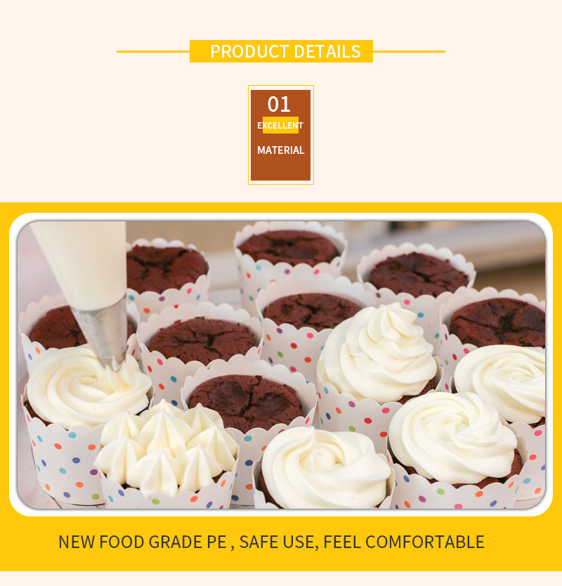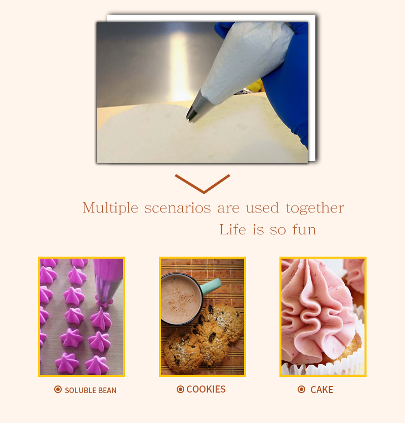 2. SCOPE OF USE: Ideal instant cake decoration, suitable for decorating wedding cakes, birthday cakes, biscuits, cupcakes, hot chocolate, holiday desserts, etc. Whether you bake regularly or just for special occasions, anyone who likes to be creative in baking will like these pastry bags.