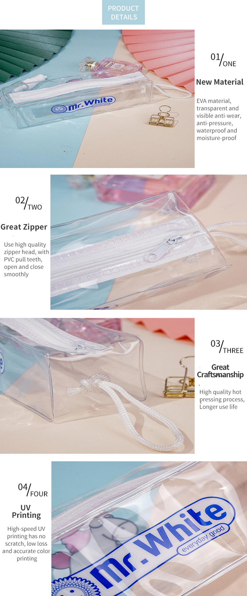 2. We can produce kinds of pvc zipper bag according to your requests. If necessary, we can give you some advice for reference;