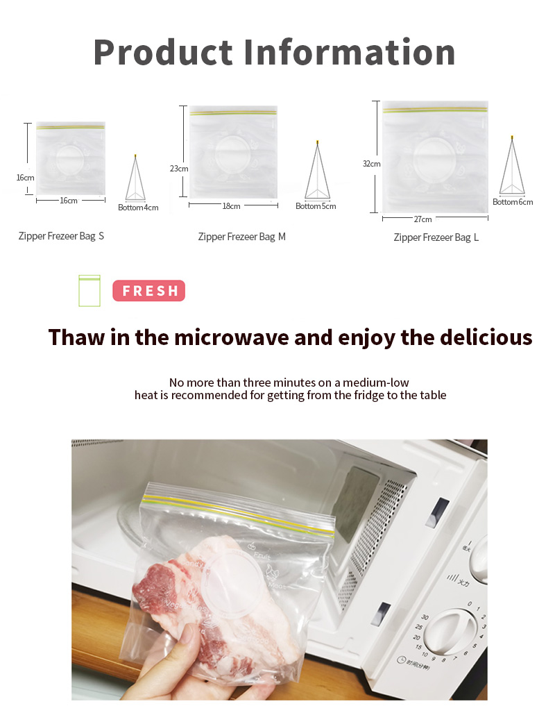 Ziplock freezer bag is for storing fruits and vegetables, mainly transparent, made of plastic, which can be sealed and opened many times.