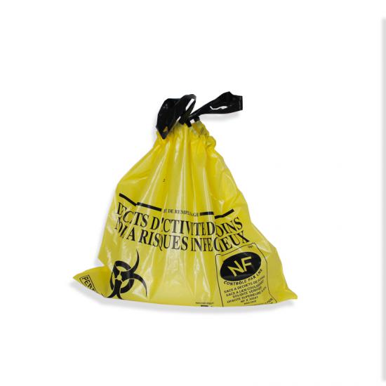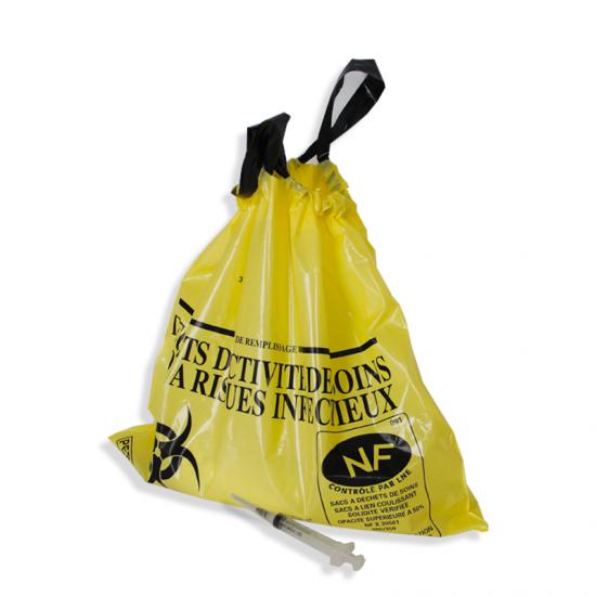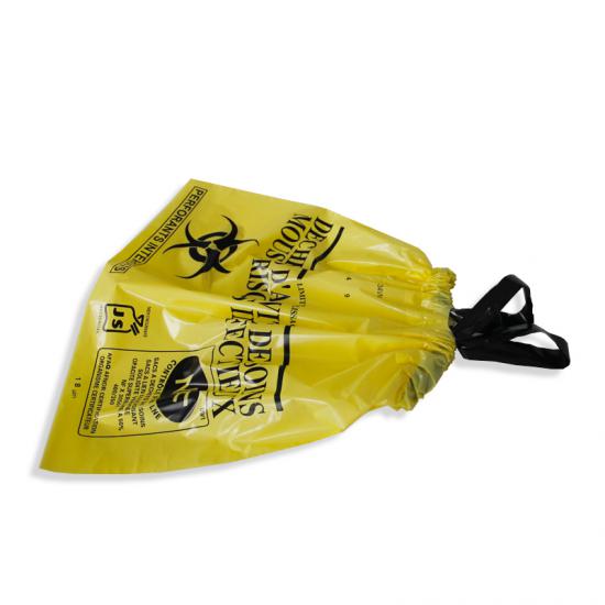 | Flat top medical waste bag | Medical waste bag with adhensive tape | T shirt medical waste bag | Drawstring medical waste bag |