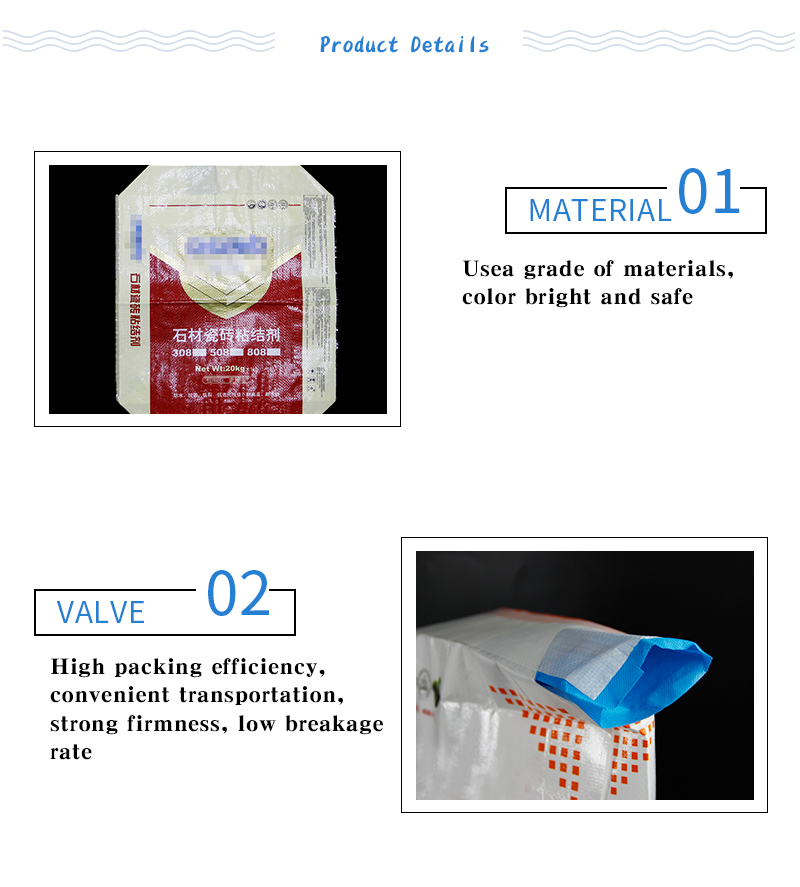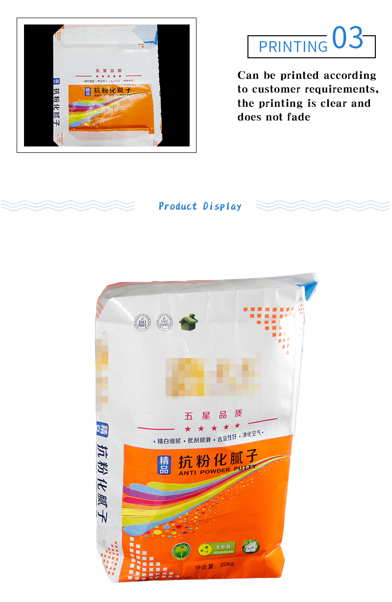 2. Our pp woven valve bag is with valve top on open part, making it convenient to use, and the valve size is customized according to your filler equipment. And the pp bag is with venting holes. Hence use our valve bag, your filling work would be performed by the machine, and it would be faster and easier, reducing much labor cost.