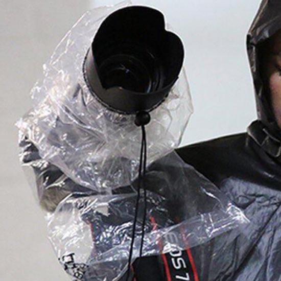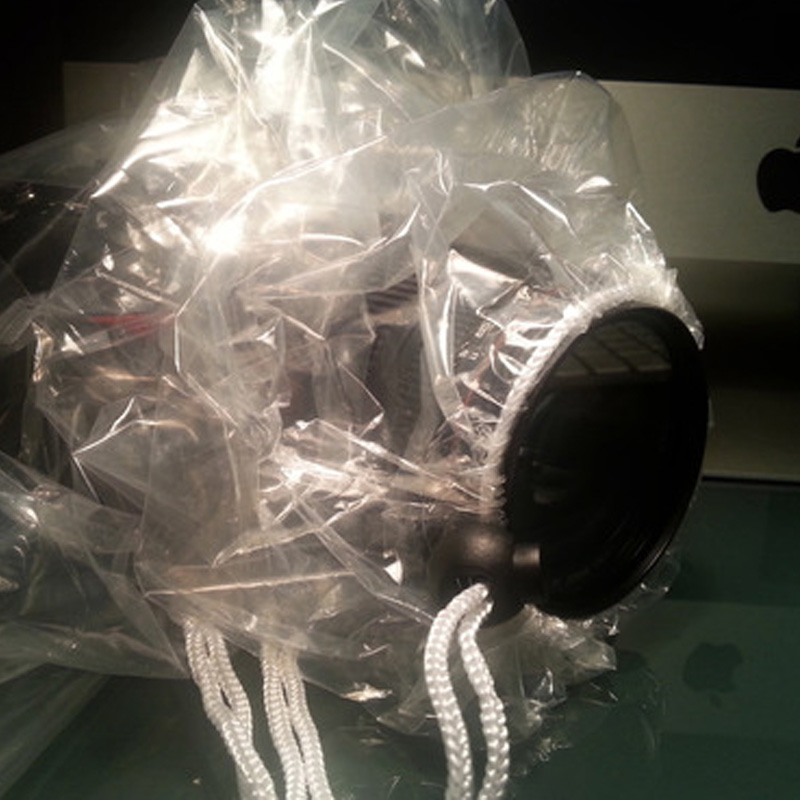 This camera rainsleeve is made of clear ldpe, it can be used for many times, pull the drawstring closures, it will fit your lens closely.