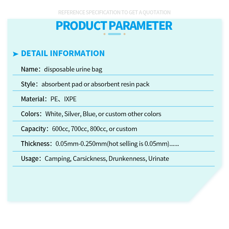 1. Please kindly inform us the material, size, thickness, color and other special requirements of emergency urine bag so that we can give you special offer;