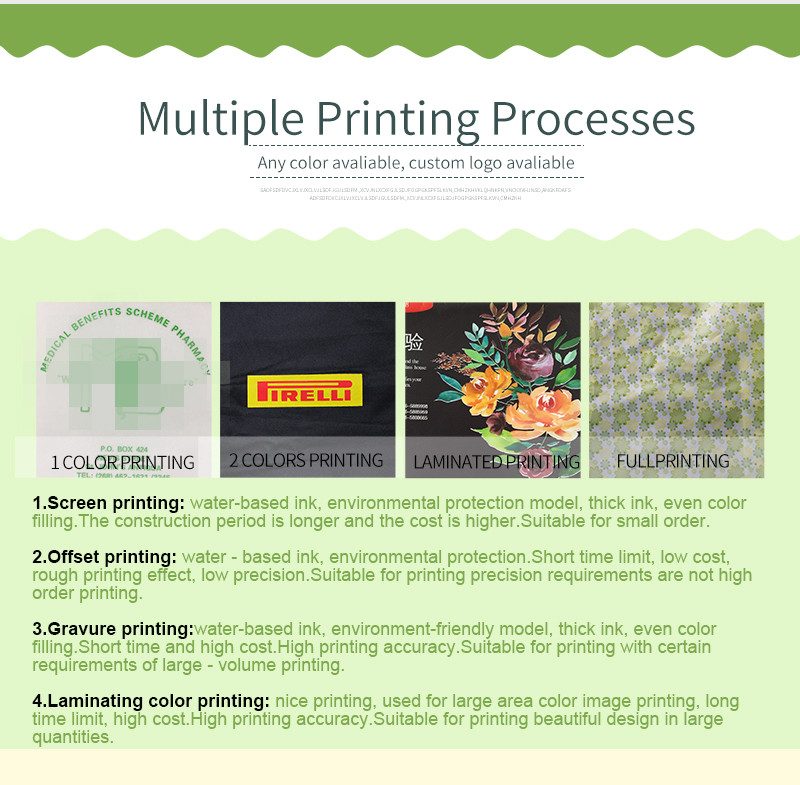 * Eco-friendly material: PO, PE, OPP, PP, PVC, CPE, PO/PE and composite material, non-woven fabric, pp woven material, other eco-friendly biodegradable or compostable material. All comply with ISO /TUV certification.
