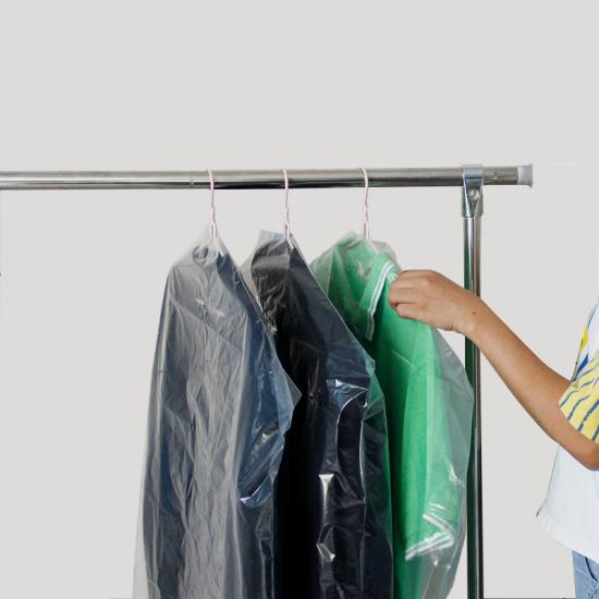 polythene clear garment bags as used by quality dry cleaners.Shaped shoulders and preformed hole for hanger hook. Ideal for closet, storage or travel.Perfect length to cover suits, shirts, blouses, tops etc. High quality 100 gauge thickness.