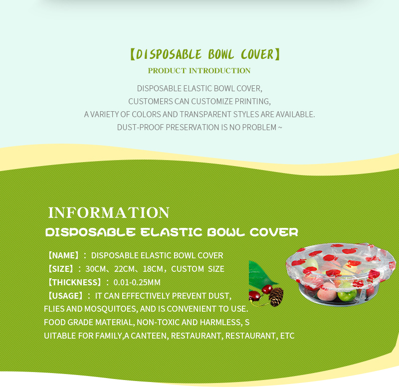 1. Please kindly inform us the material, size, thickness, color , print or any other special requirements of plastic food covers so that we can give you special offer;
